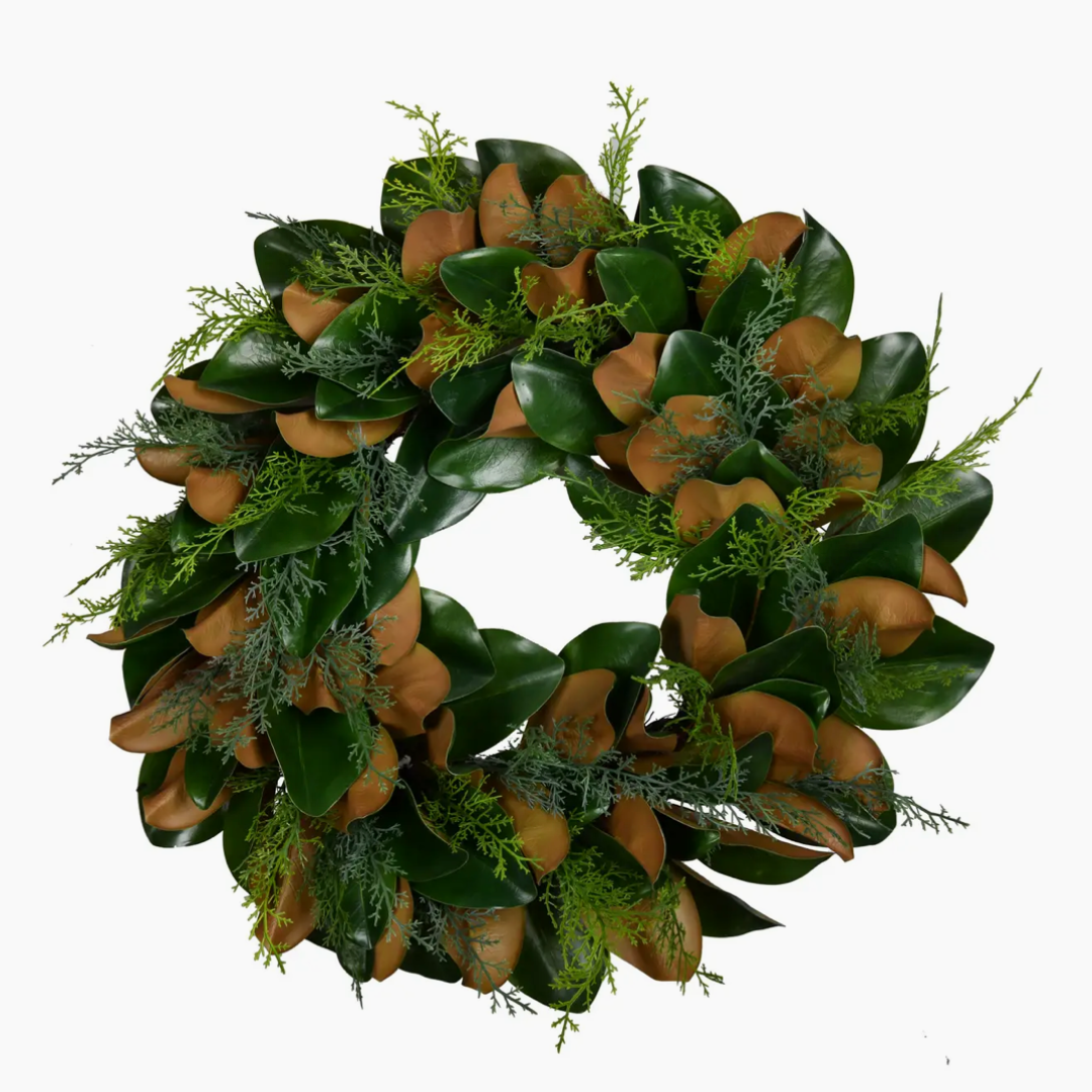 24-inch realistic looking faux magnolia and evergreen wreath that blends classic greenery with a bit of seasonal charm. The wreath features deep green faux magnolia leaves with warm brown undersides and layered evergreen accents, this wreath offers a full, textured look that works beautifully for winter and beyond. Its timeless design makes it a versatile piece for seasonal decorating and can be used year after year.